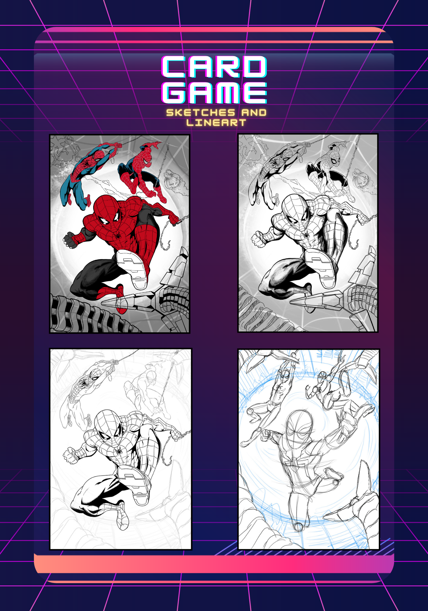 Ilustração concebida, desenhada e pintada digitalmente como estudo avançado de arte para card games, inspirada na franquia Spider-Man e em jogos digitais como Marvel Snap. A composição explora ação contínua, profundidade espacial e múltiplas variações do personagem, reforçando o conceito de multiverso e sinergia visual, fundamentais em sistemas de cartas colecionáveis e competitivos.