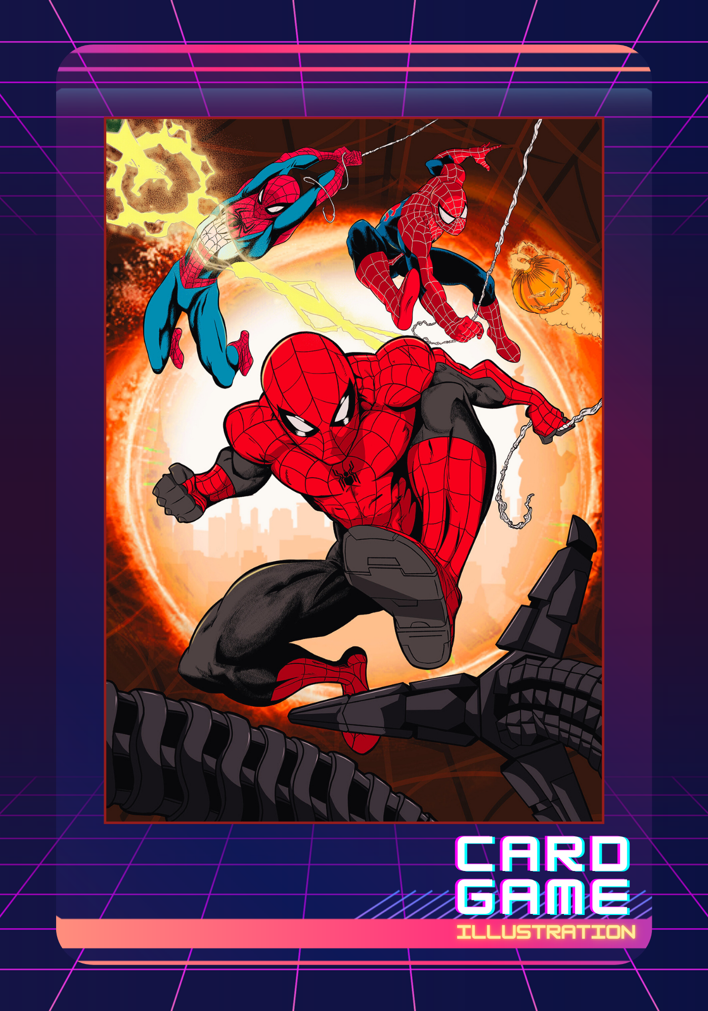 Digitally illustrated and fully painted artwork developed as an advanced card game art study, inspired by the Spider-Man franchise and digital games such as Marvel Snap. The composition emphasizes continuous action, spatial depth, and multiple character variants, reinforcing the multiverse concept and visual synergy essential to collectible and competitive card game systems. The color palette was deliberately designed to evoke the visual language of games and comic books, enhancing contrast, readability, and visual impact in digital environments.