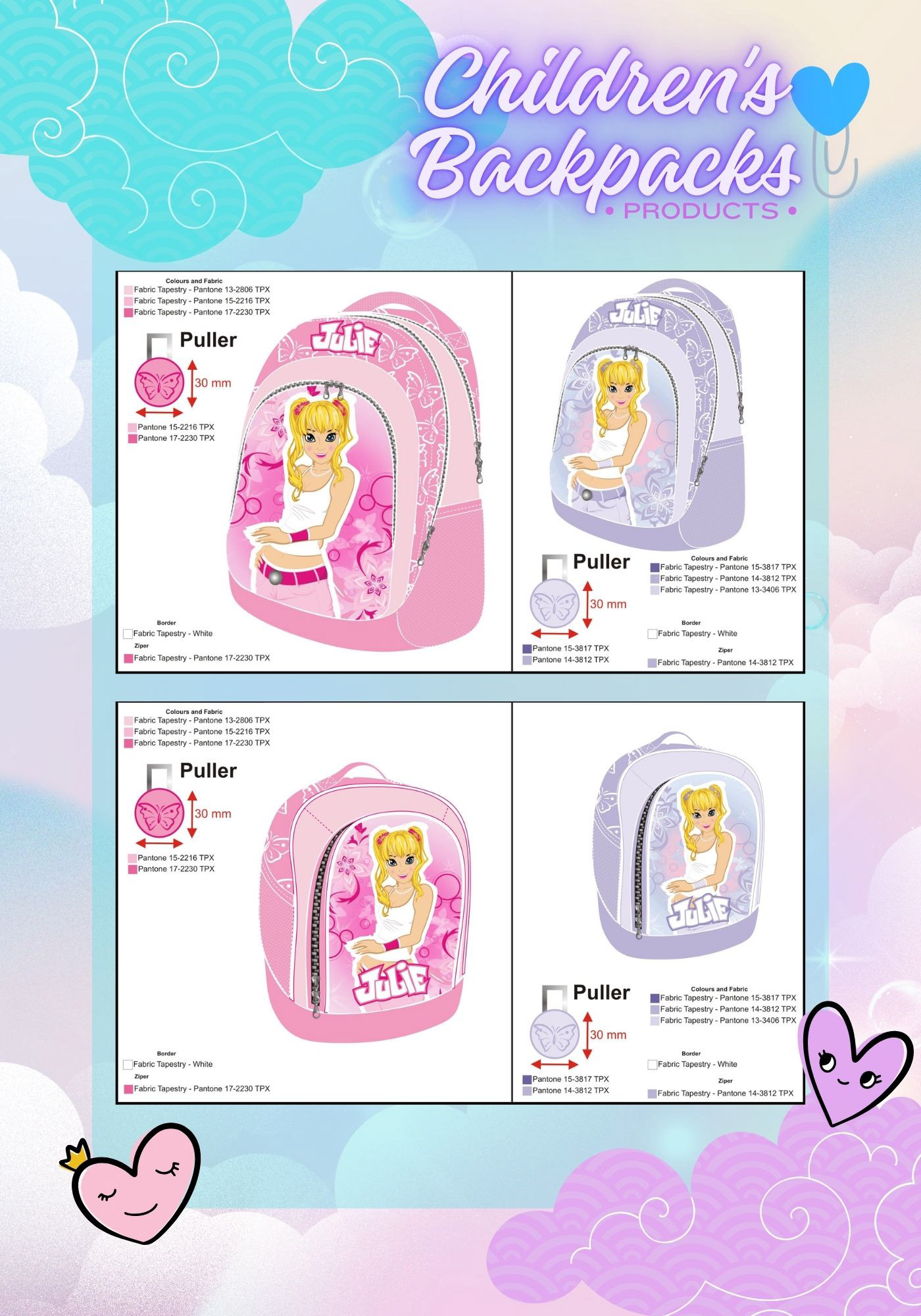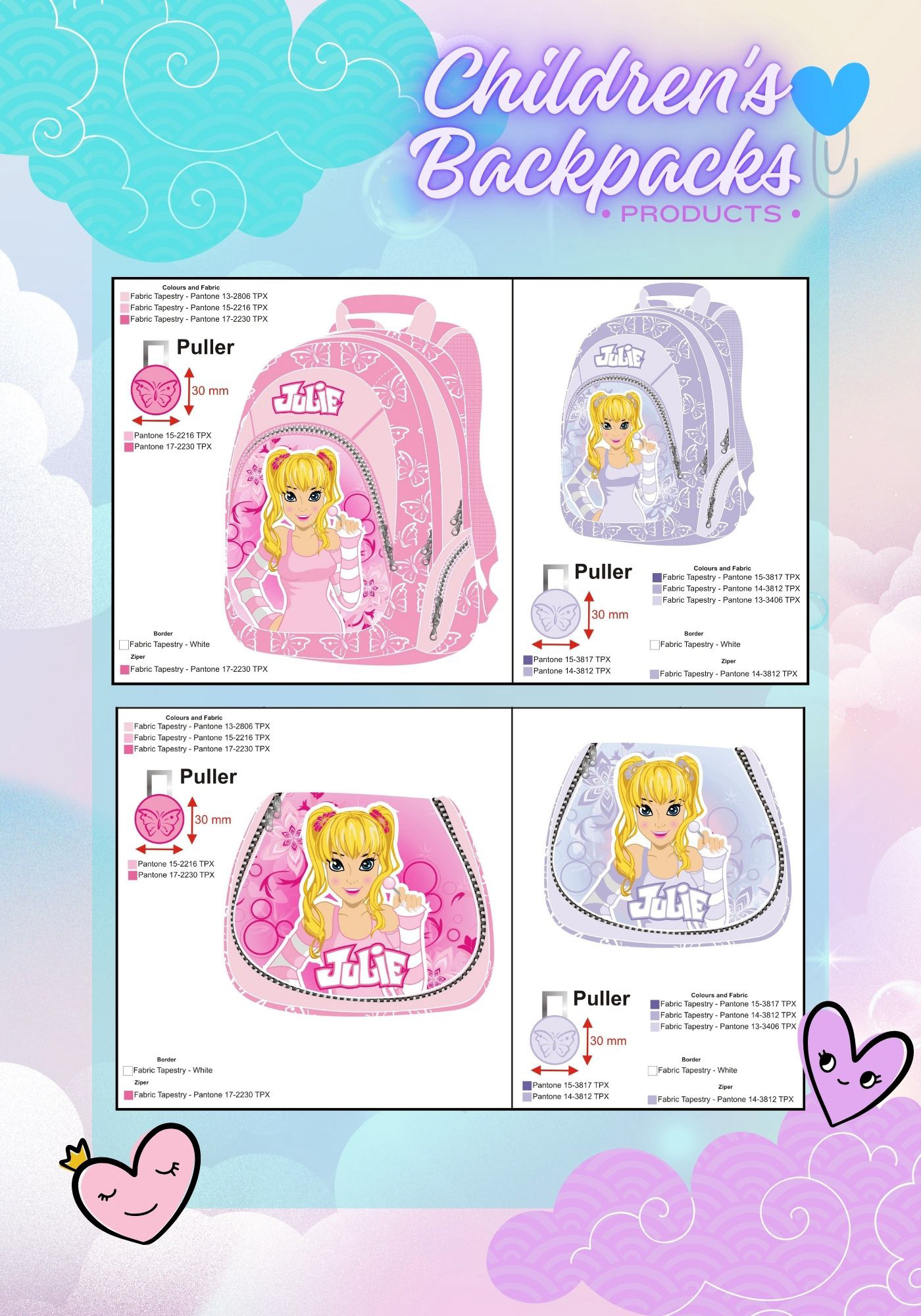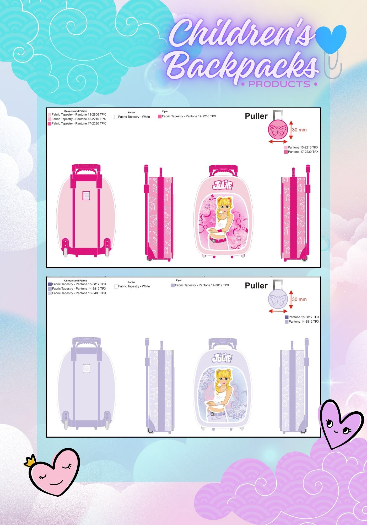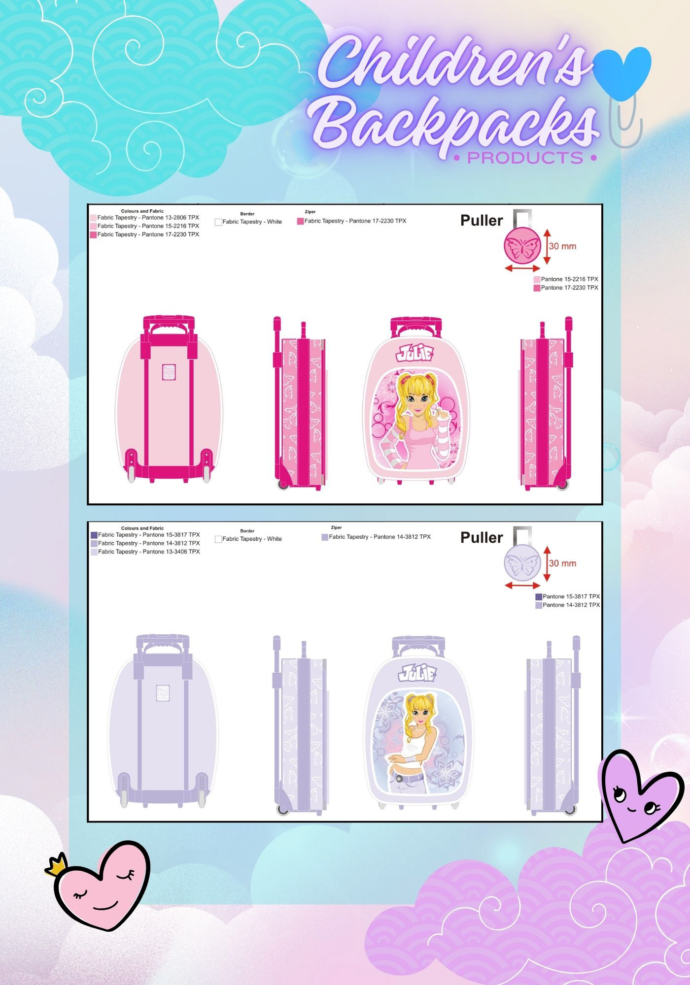 The collection was produced in two color variants — pink and lilac, maintaining full consistency with the established visual identity, including patterns, character illustration, Pantone color specifications, materials, zippers, and custom pullers.