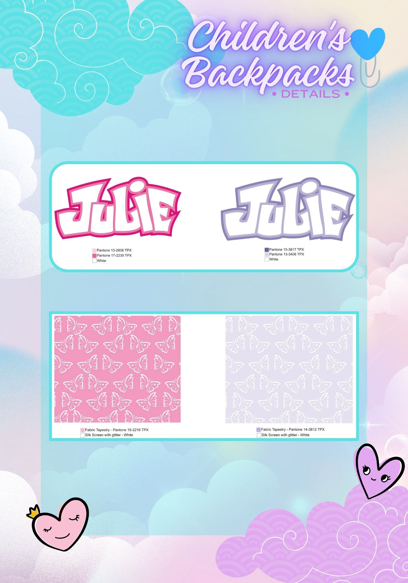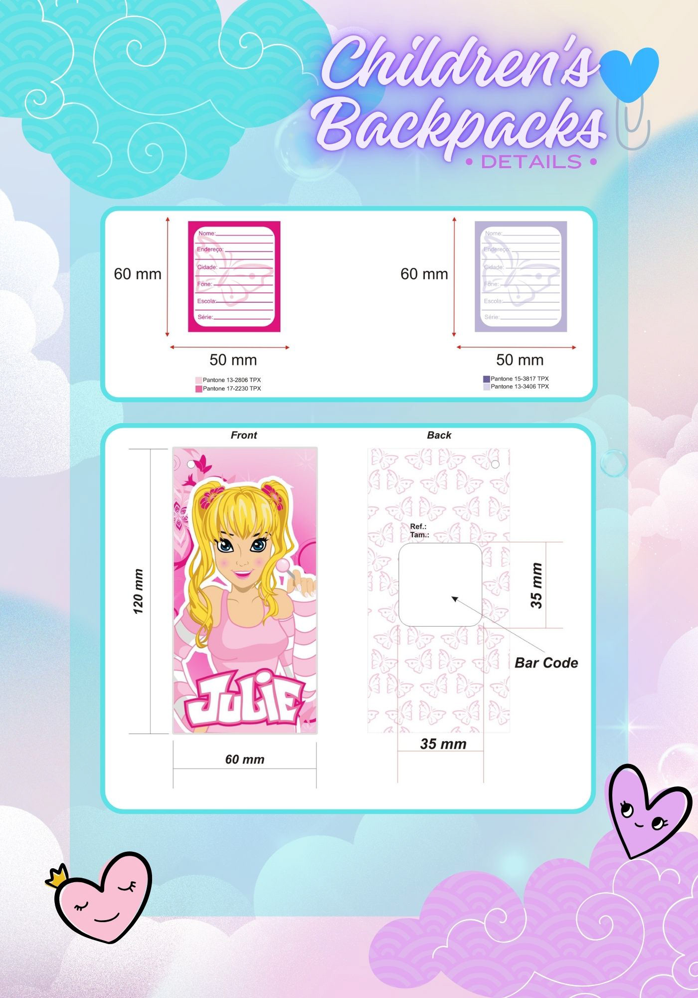 The custom children’s ID label was designed to help identify the backpack in school environments, featuring clear fields for name, address, school, and contact information. The layout follows the Julie brand’s visual system, with Pantone-based color standards, clean graphic structure, and dimensions optimized for readability and daily use durability.