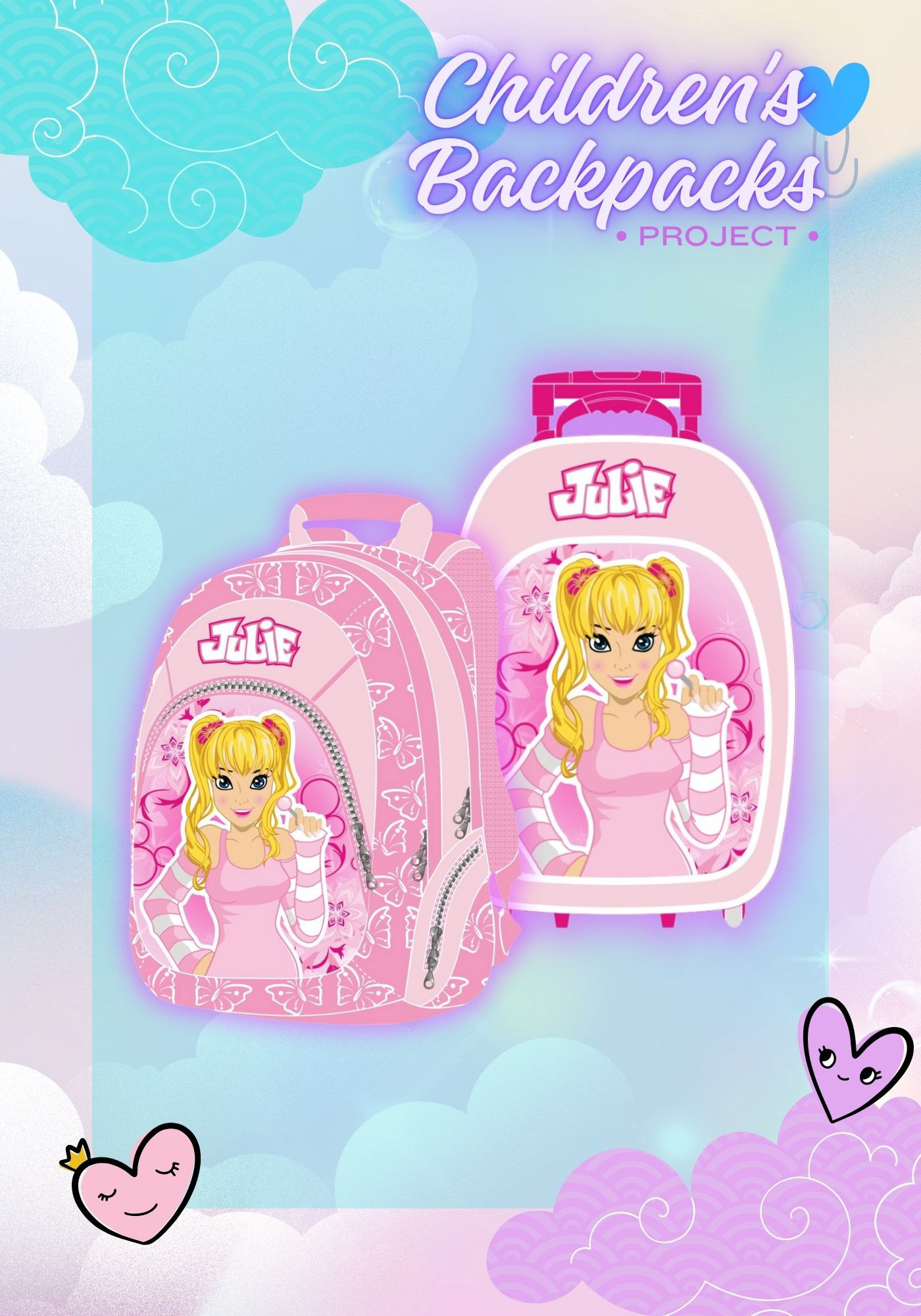 The project introduces a new illustration pattern featuring the Julie character, applied to the trolley backpack format, while maintaining full consistency with the brand’s visual identity. The adaptation required adjustments in graphic composition, illustration framing, pattern distribution, and visual balance for the vertical trolley structure.