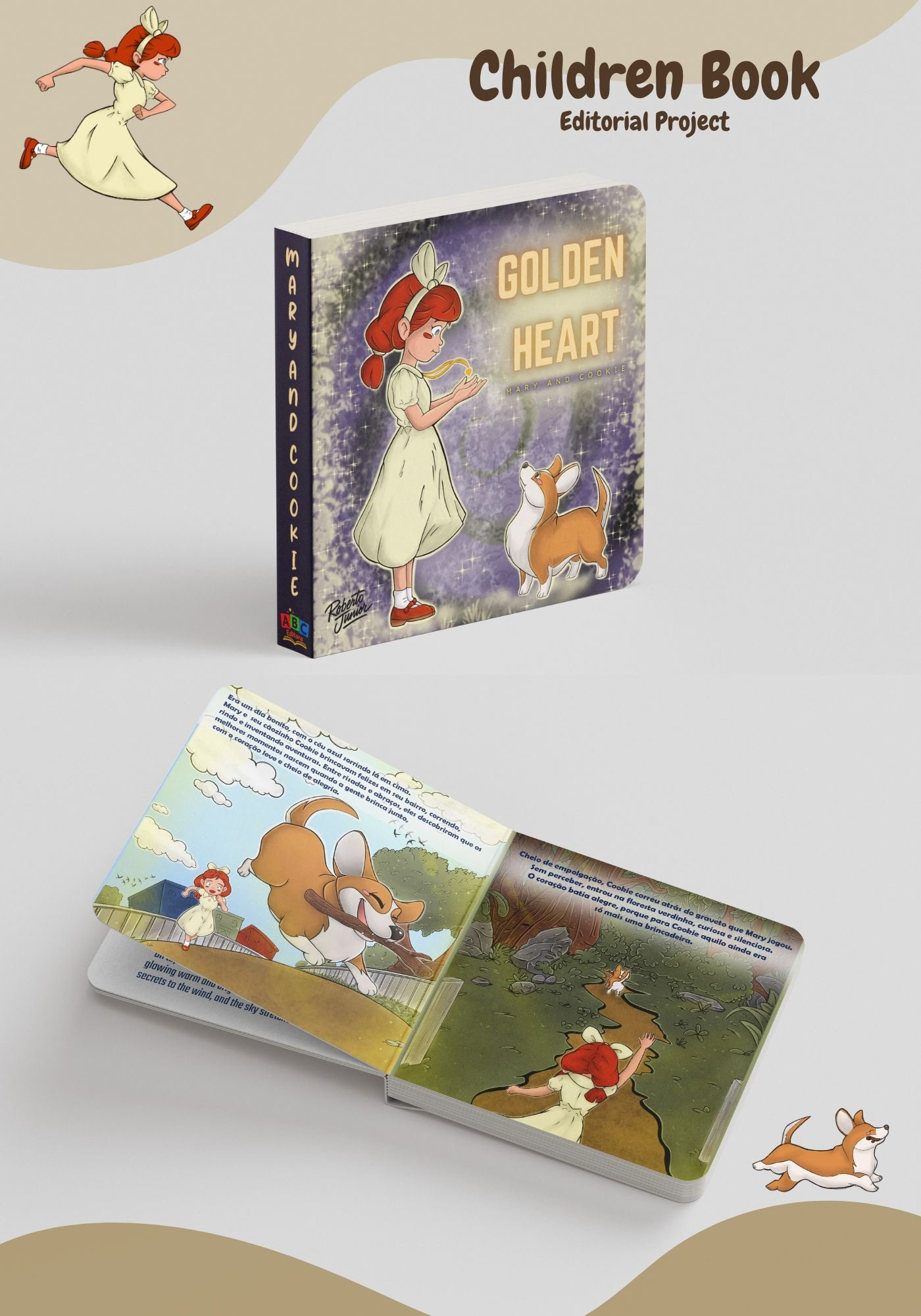 Golden Heart é um projeto de livro infantil desenvolvido especialmente para crianças em fase de alfabetização. O trabalho envolve todas as etapas do processo criativo — conceito, ilustração, narrativa visual e construção das imagens — com foco em estimular a leitura, a imaginação e a conexão emocional, utilizando cores vivas e personagens cheios de expressividade, com uma linguagem visual clara, acessível e acolhedora para o público infantil. Golden Heart is a children’s book project created specifically for early readers and children in the literacy development stage. The project covers all stages of the creative process — concept, illustration, visual storytelling, and image development — focusing on encouraging reading, imagination, and emotional connection through vibrant colors and highly expressive characters, using a clear, accessible, and child-friendly visual language.