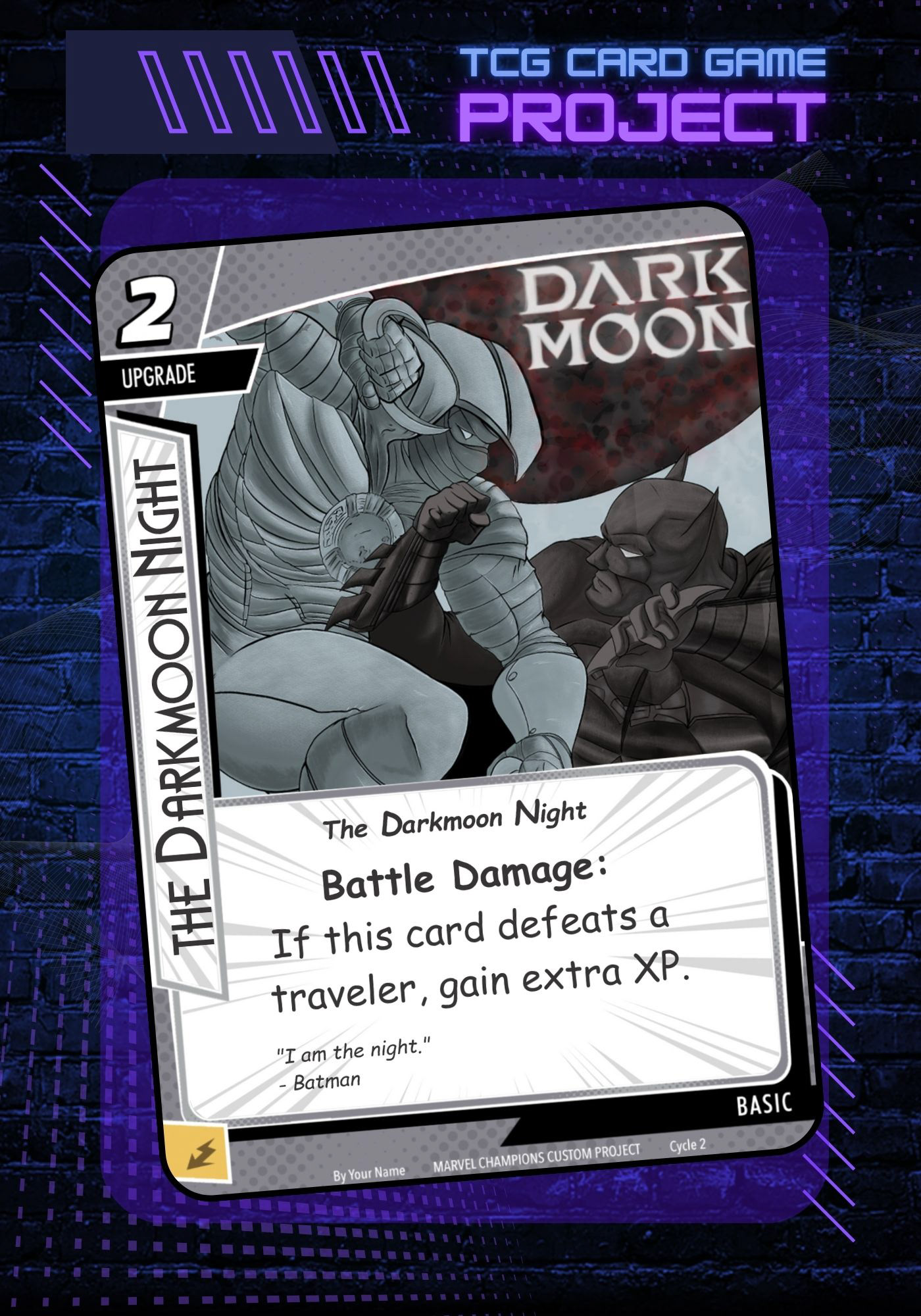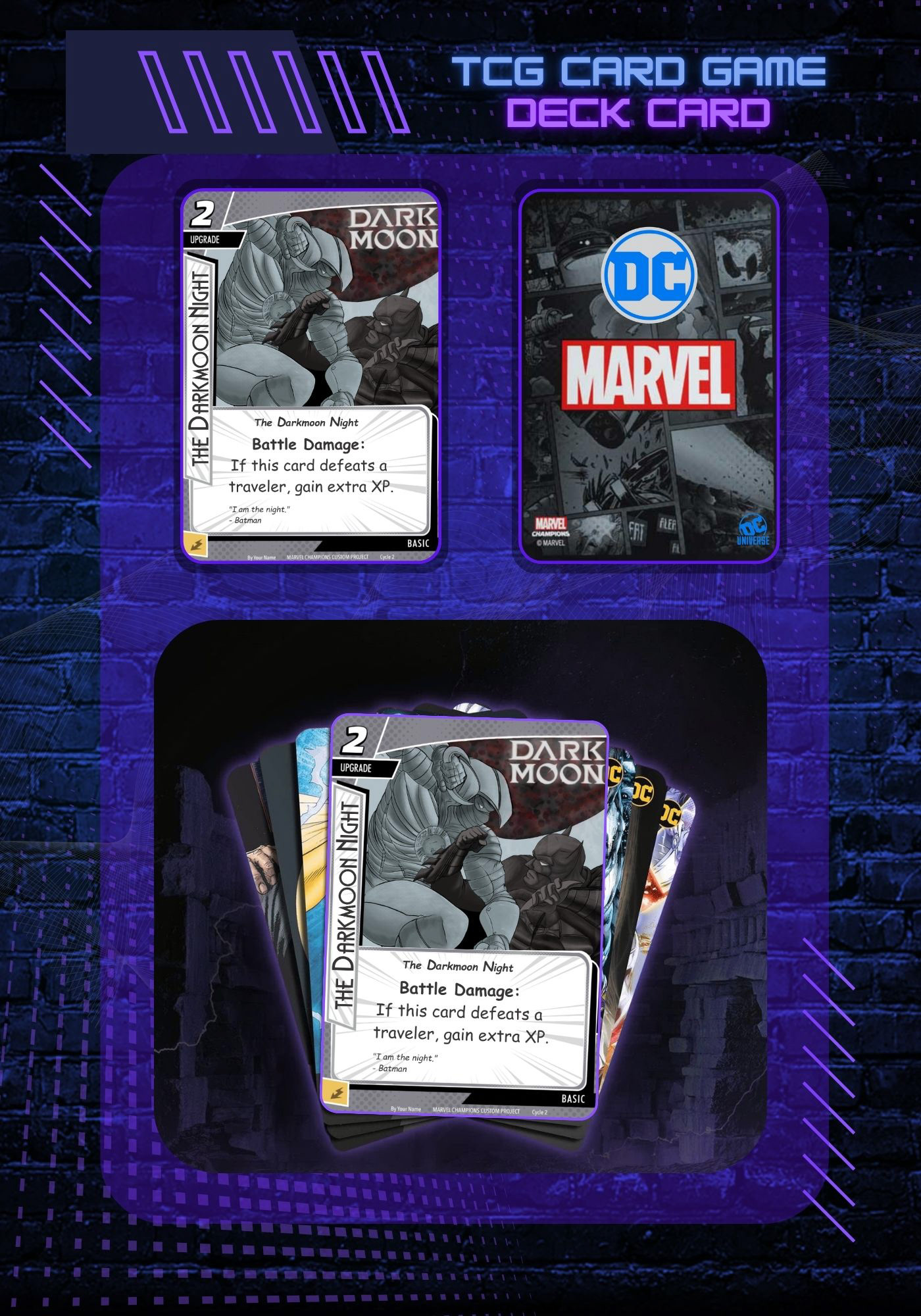 Darkmoon is a conceptual Trading Card Game (TCG) project created to explore illustration, card design, and practical application for card-based games. The concept presents a symbolic clash between iconic DC and Marvel characters, represented here by Batman and Moon Knight, using a visual language inspired by comics and the gaming industry.