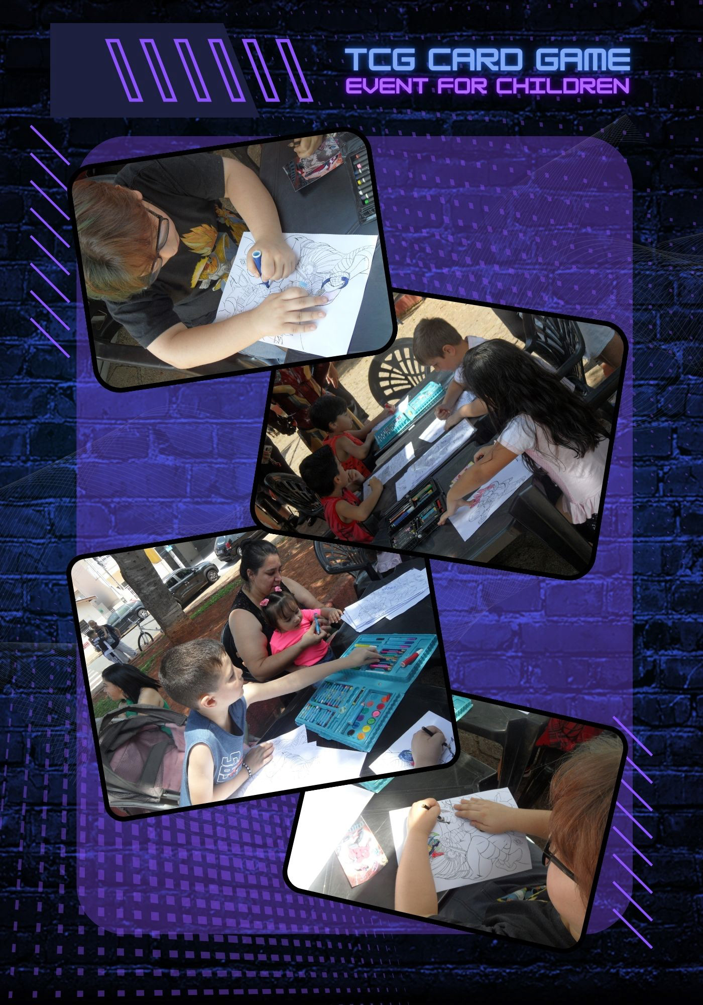 Esta etapa do projeto Darkmoon se conecta a uma ação beneficente voltada ao público infantil, na qual levei ilustrações autorais para que as crianças pudessem colorir e interagir livremente com o desenho. Entre elas, estava a arte que posteriormente foi utilizada no desenvolvimento do card game, criando uma ponte direta entre o processo criativo profissional e uma experiência lúdica e acessível para as crianças.