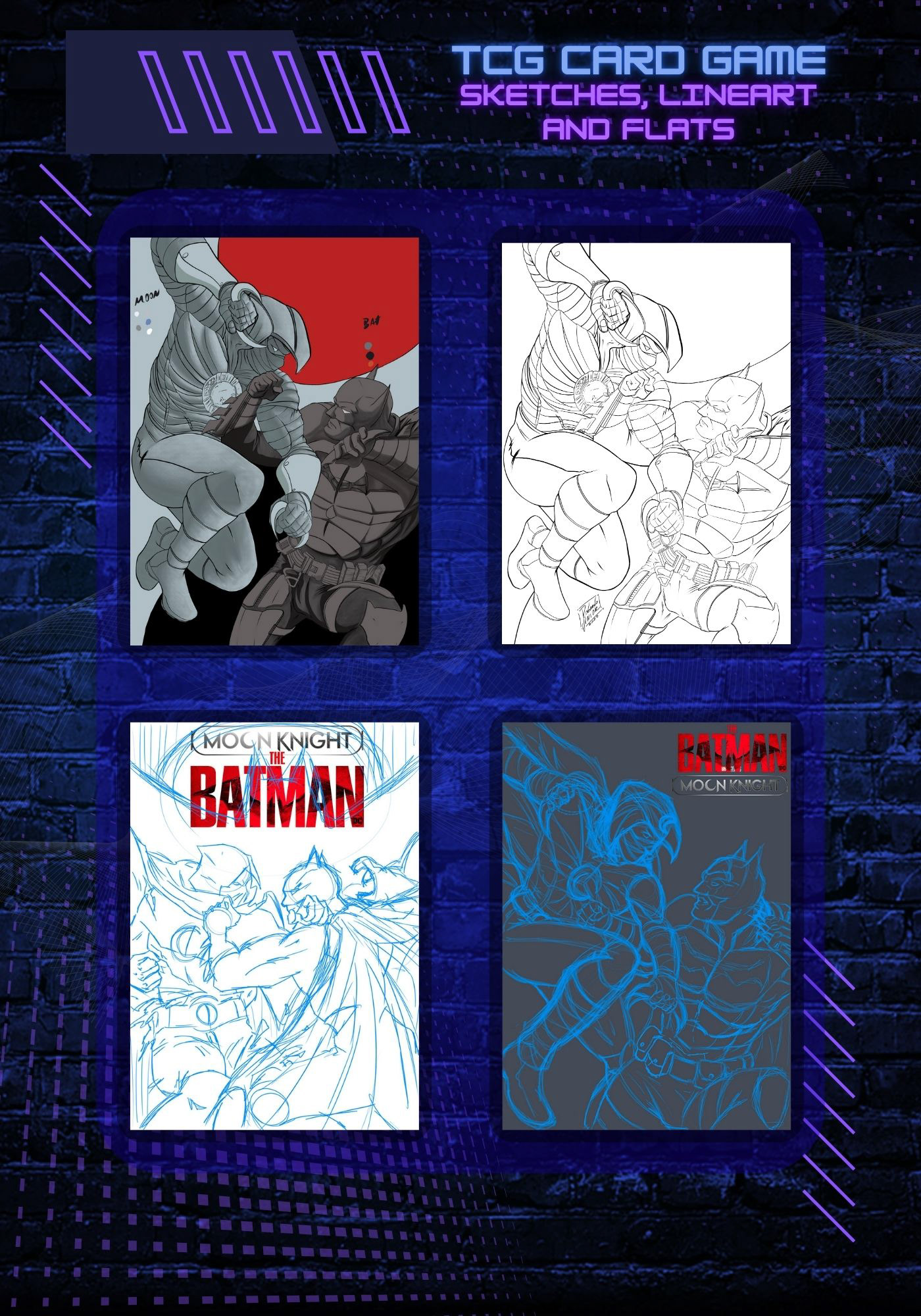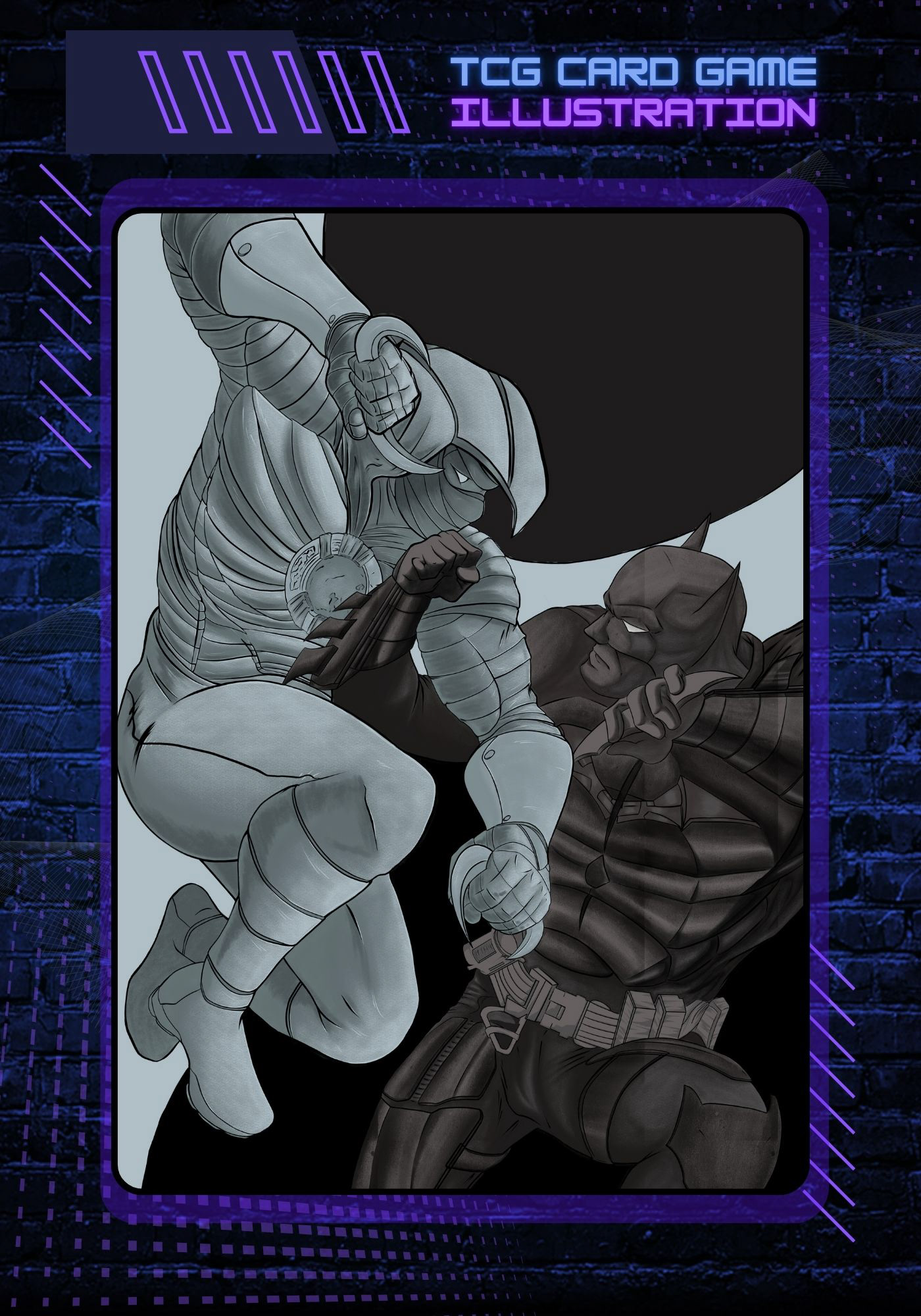 um conceito de TCG (Trading Card Game) inspirado na linguagem visual e narrativa dos universos de quadrinhos e jogos de cartas modernos. A cena retrata o confronto direto entre o Batman e o Cavaleiro da Lua, explorando contraste de silhuetas, ritmo de ação e leitura clara da composição — elementos fundamentais para cartas que precisam comunicar impacto imediato em escala reduzida.